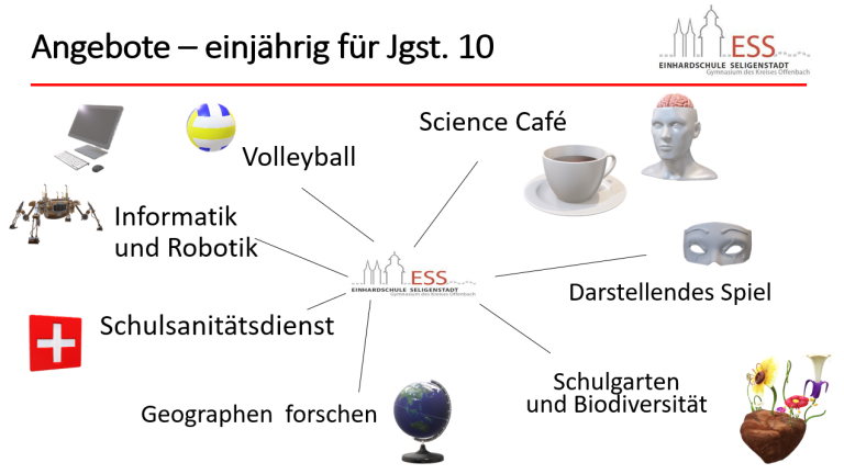 Die hessische Stundentafel sieht für die Jahrgangsstufen 9 und 10 Wahlunterricht vor. An der Einhardschule können die Schülerinnen und Schüler aus mehreren Angeboten auswählen.